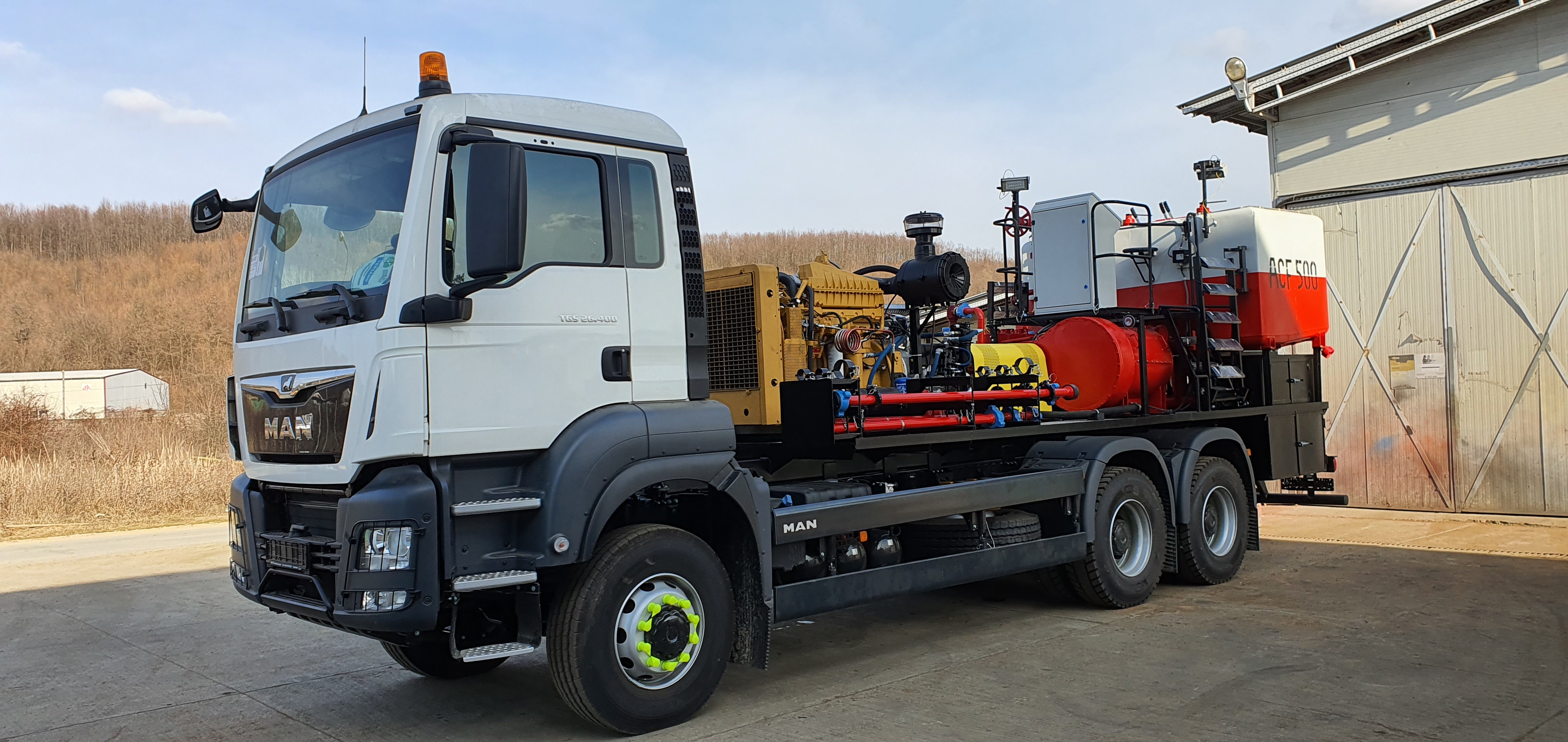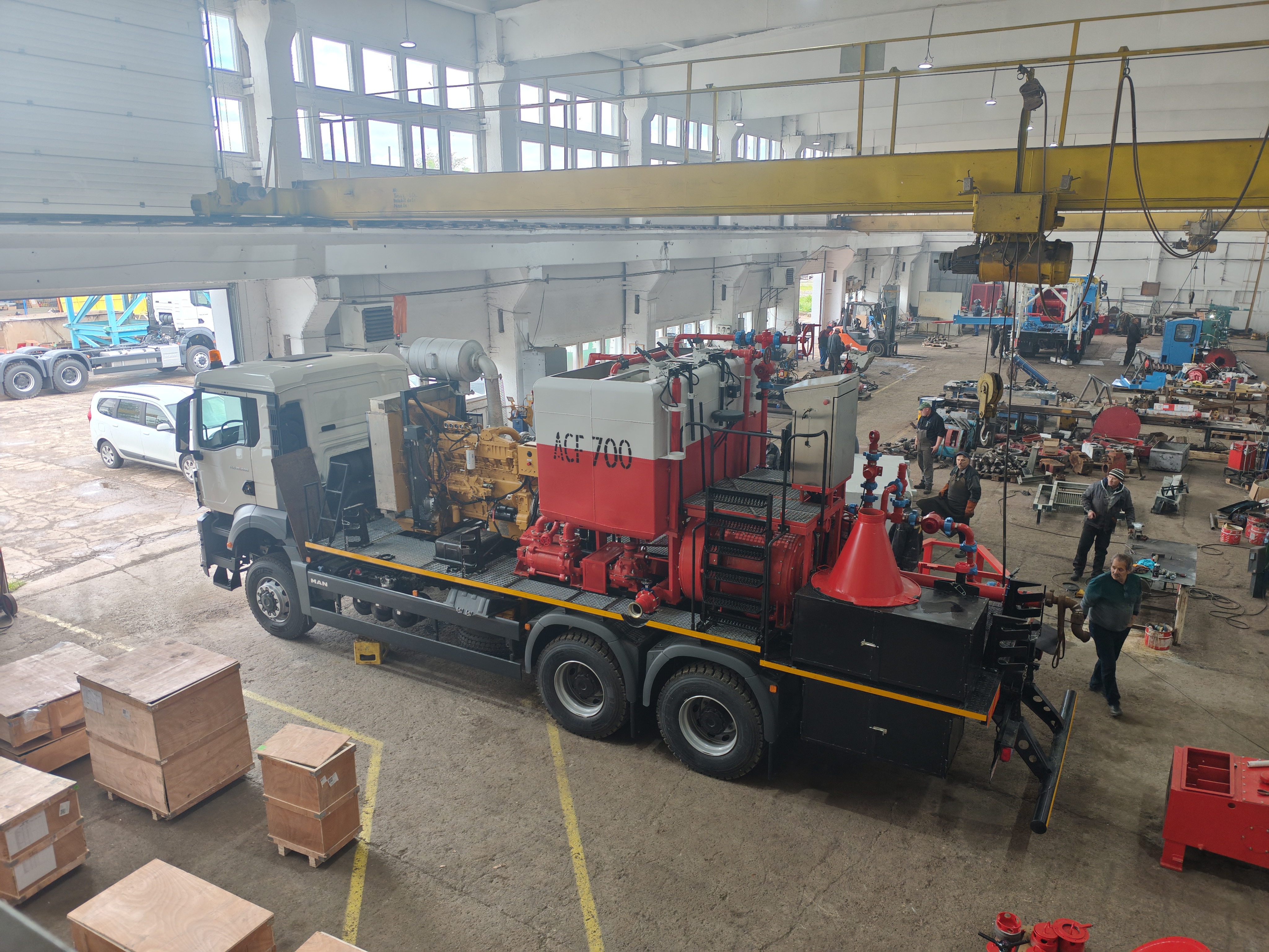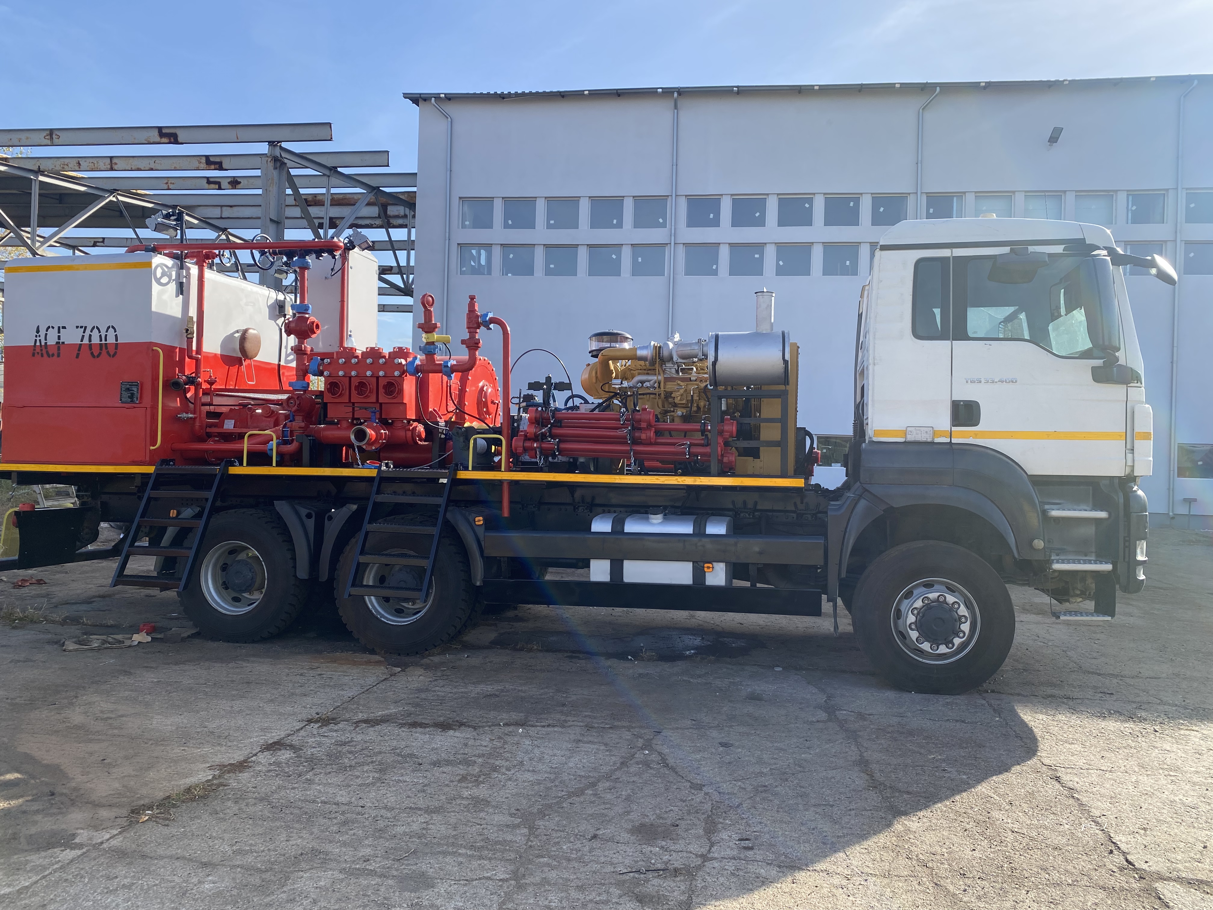 Large utility truck with mounted industrial equipment in a parking lot. Large truck with industrial equipment parked inside a spacious factory workshop. Large industrial workshop with machinery, equipment, and a truck inside. White utility truck with mounted industrial machinery parked outdoors. Industrial truck carrying red and yellow machinery parked near a white building. Two large utility trucks parked in an industrial yard under a partly cloudy sky. White industrial truck with machinery and tanks on its flatbed, parked outdoors by a building.
