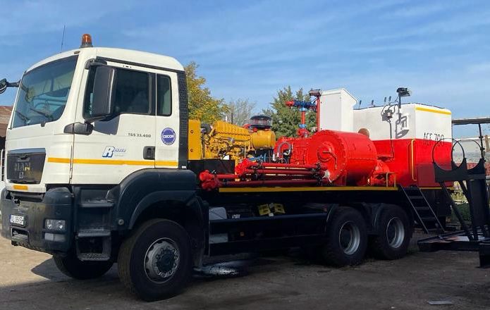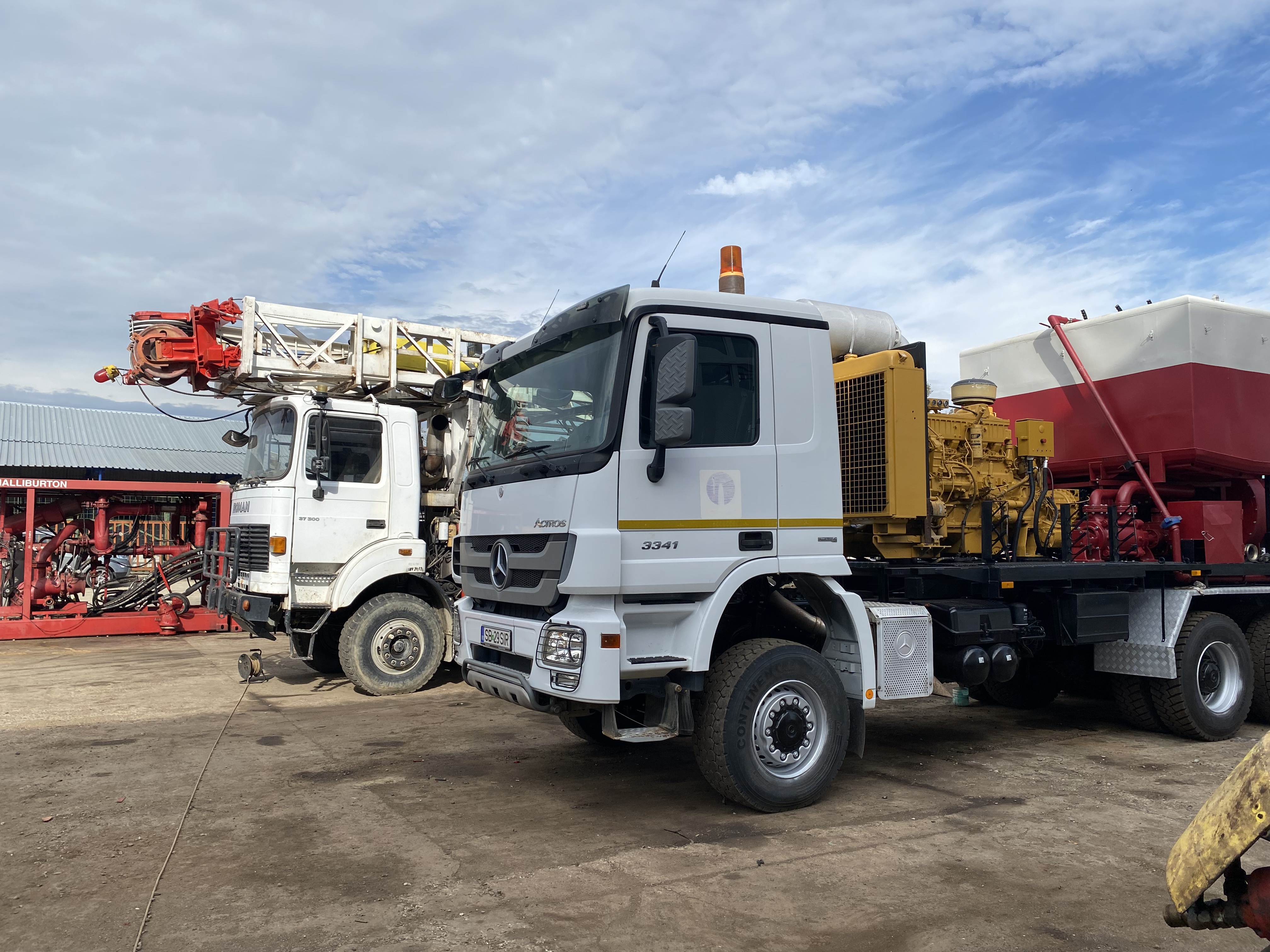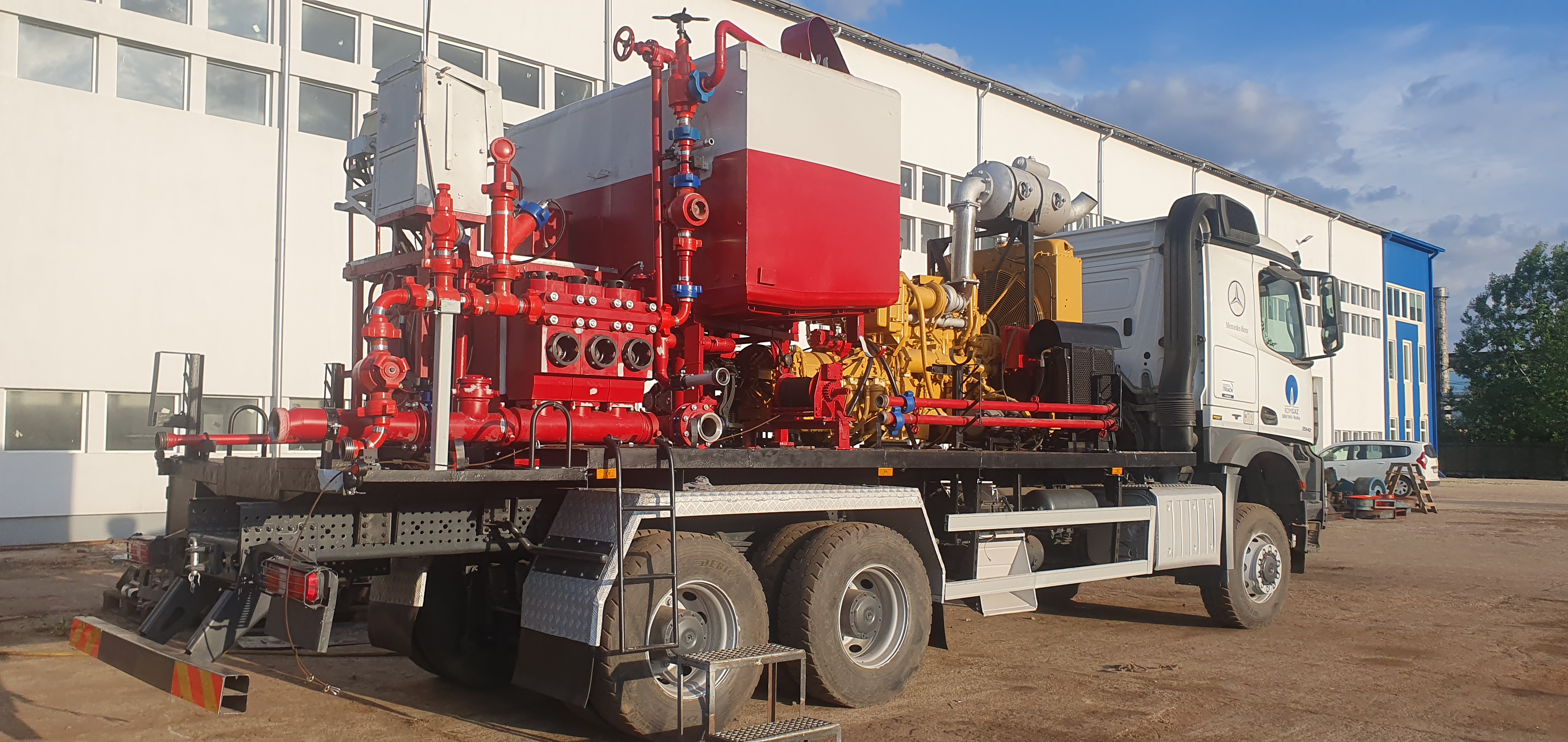 Large utility truck with mounted industrial equipment in a parking lot. Large truck with industrial equipment parked inside a spacious factory workshop. Large industrial workshop with machinery, equipment, and a truck inside. White utility truck with mounted industrial machinery parked outdoors. Industrial truck carrying red and yellow machinery parked near a white building. Two large utility trucks parked in an industrial yard under a partly cloudy sky. White industrial truck with machinery and tanks on its flatbed, parked outdoors by a building.