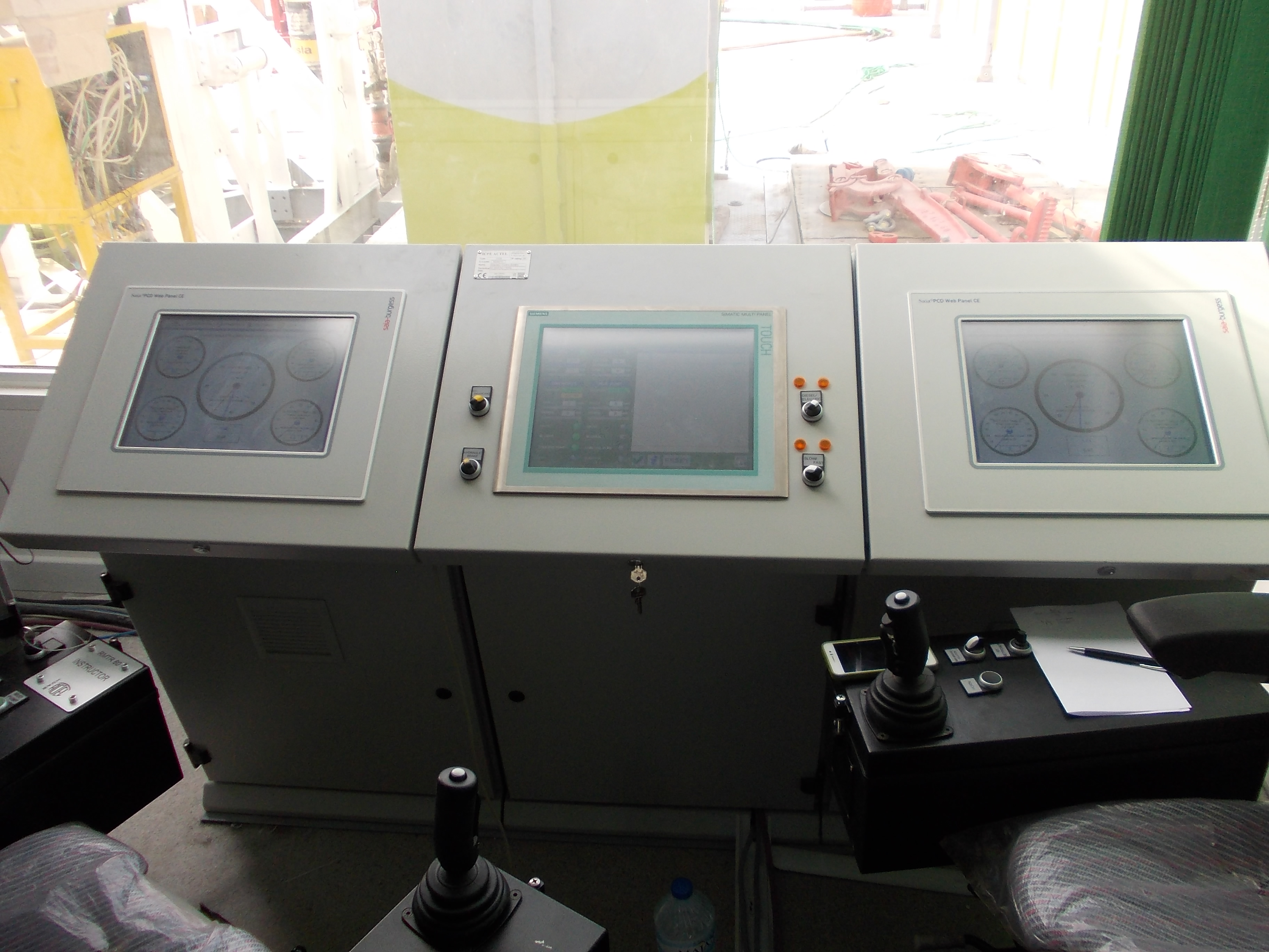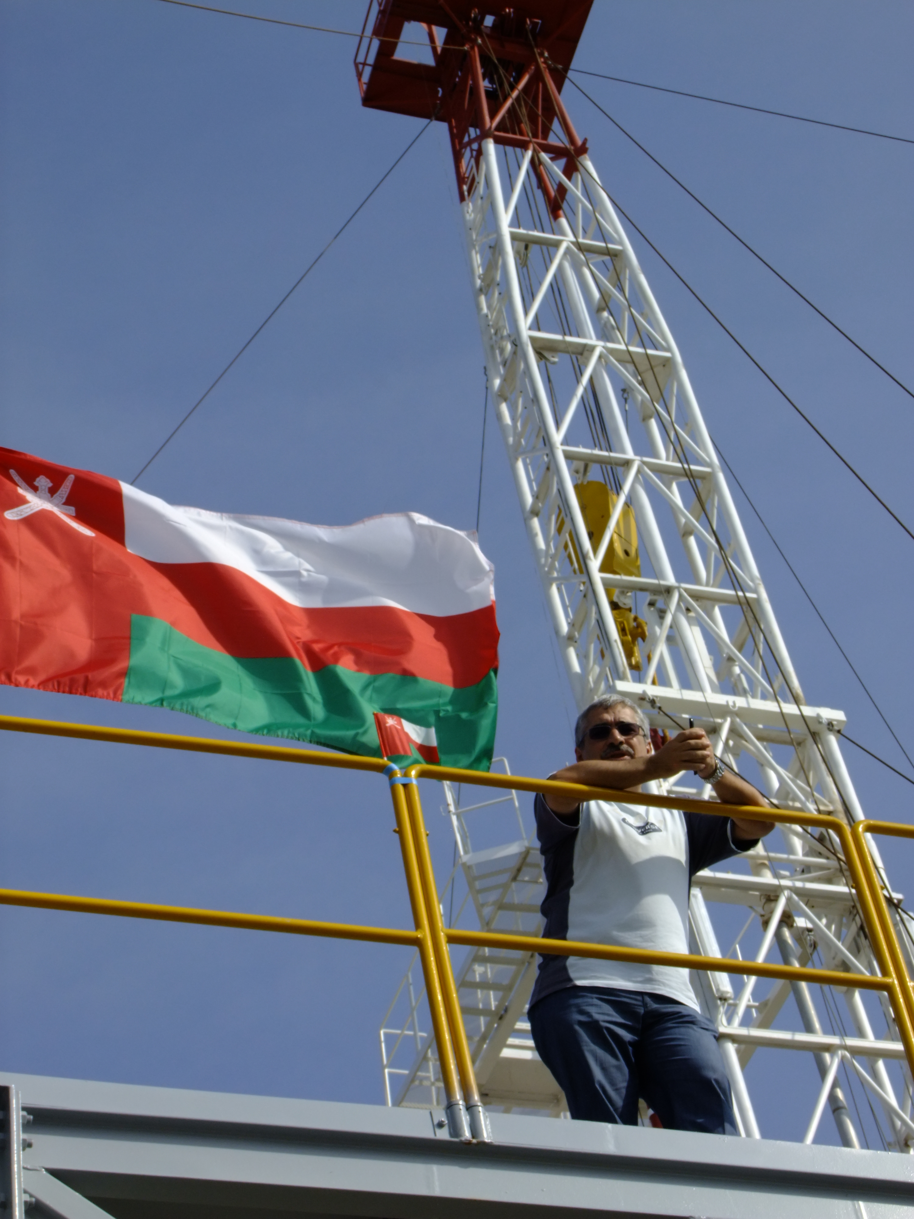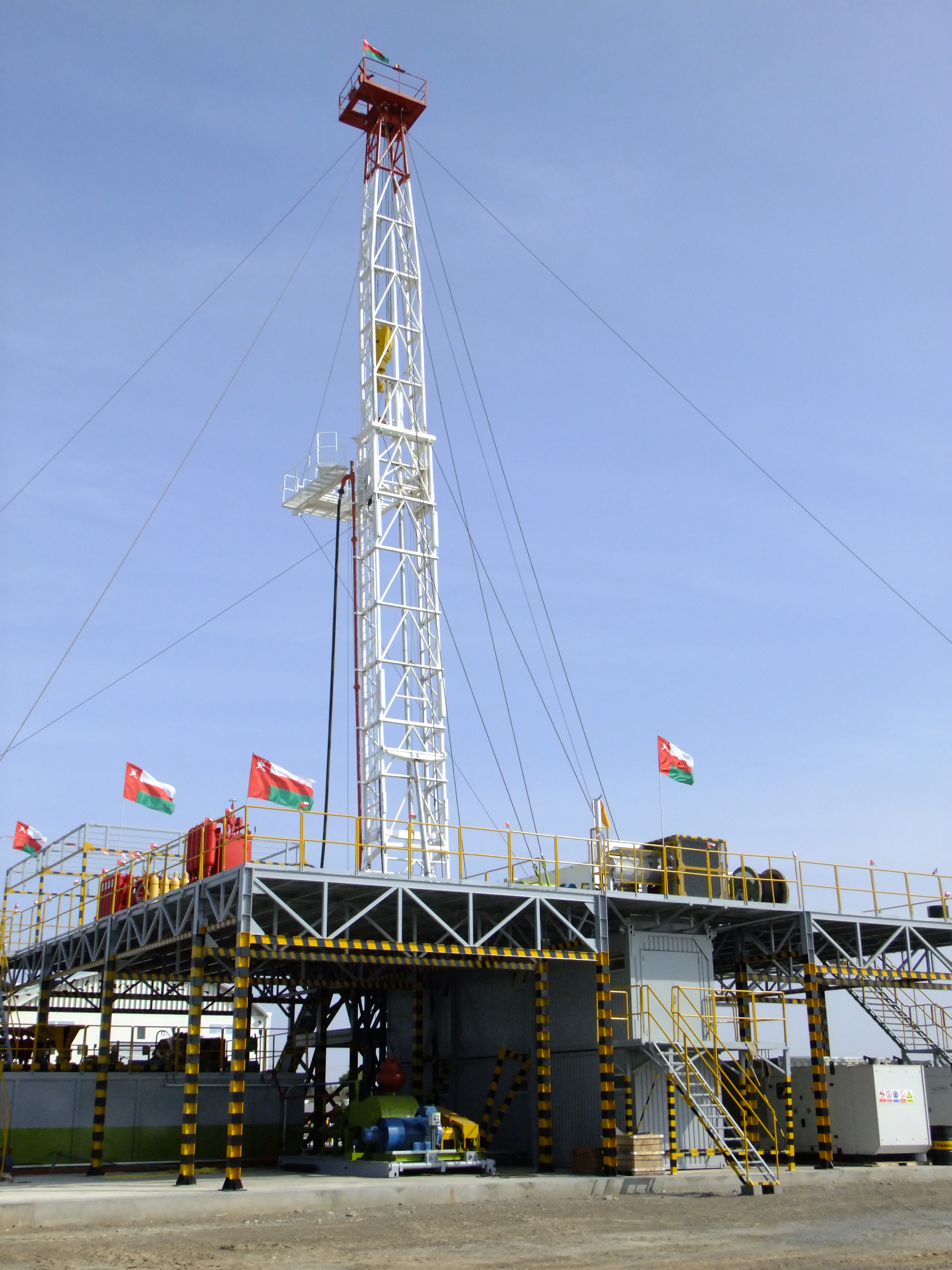 Aerial view of an oil drilling rig in a desert landscape. Man standing on platform near Omani flag and tall metal oil rig against blue sky. Oil drilling rig with safety barriers, stairs, and flags under a clear blue sky. Oil drilling rig with flags against clear blue sky Tall oil drilling rig structure with red, white, and green flag against blue sky. Workers in hard hats and coveralls standing on an elevated platform at an oil rig. Oil drilling rig on a flat, dry landscape under a clear blue sky. Industrial platform with safety and caution signs near large red machinery. Man in a hard hat stands in front of an oil drilling rig under a partly cloudy sky. Illuminated oil drilling rig tower against a dark night sky. Oil drilling rig lit up at night with a crane beside it. Construction site with a crane, drilling rig, and truck under a cloudy sky. Industrial control panel with three touch screens and joysticks. Narrow room with electrical control panels and overhead fluorescent light. Empty conference room with U-shaped tables, black chairs, and screens on the wall. Modern control room with two operator chairs, computer screens, and a whiteboard nearby. Industrial control panel with gauges, switches, and a touchscreen display. Silhouette of an oil rig against a bright sky with clouds and sun. Person standing on a tall red metal tower with an Indian flag against a clear blue sky. Large industrial crane with workers standing on a construction site.
