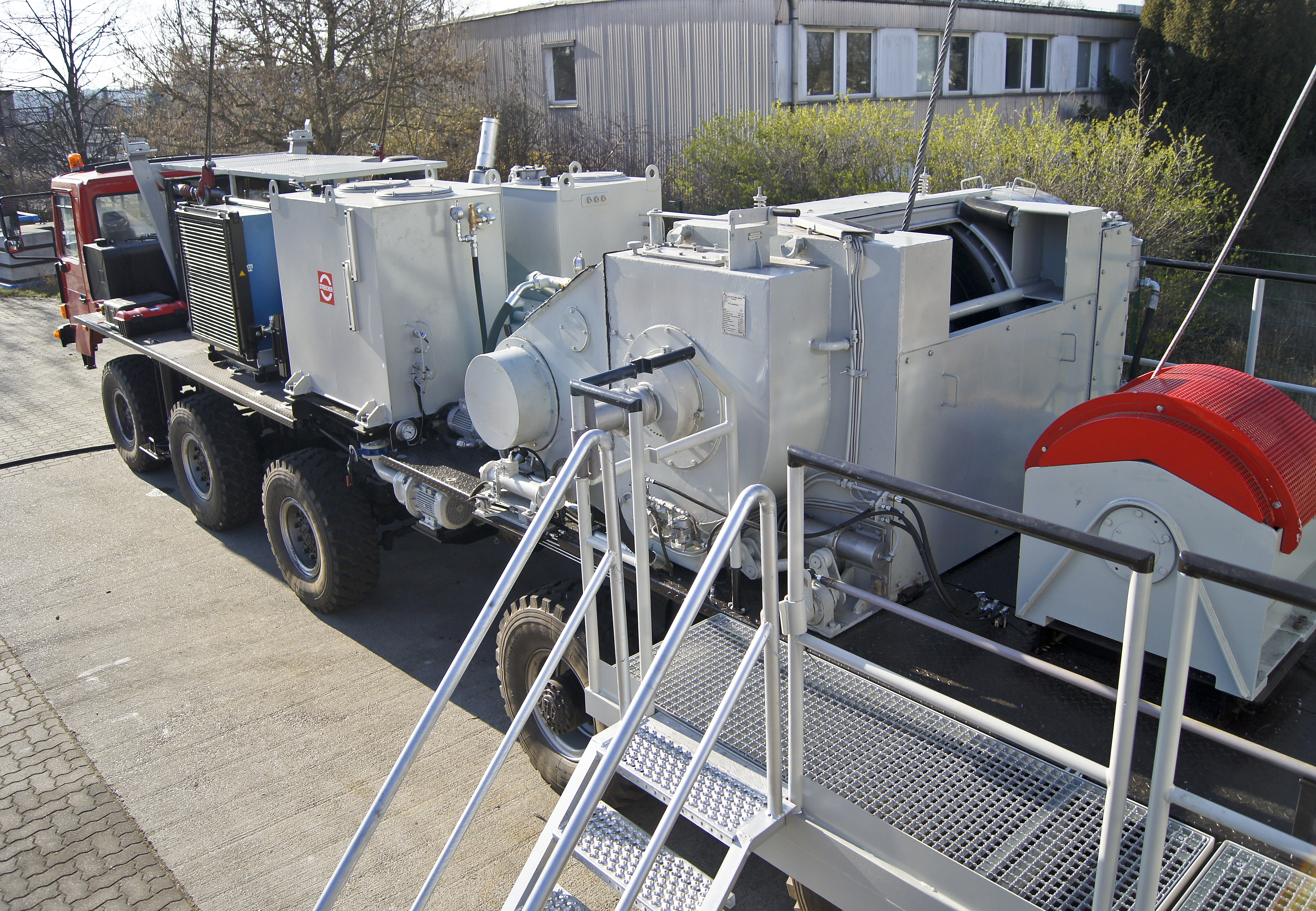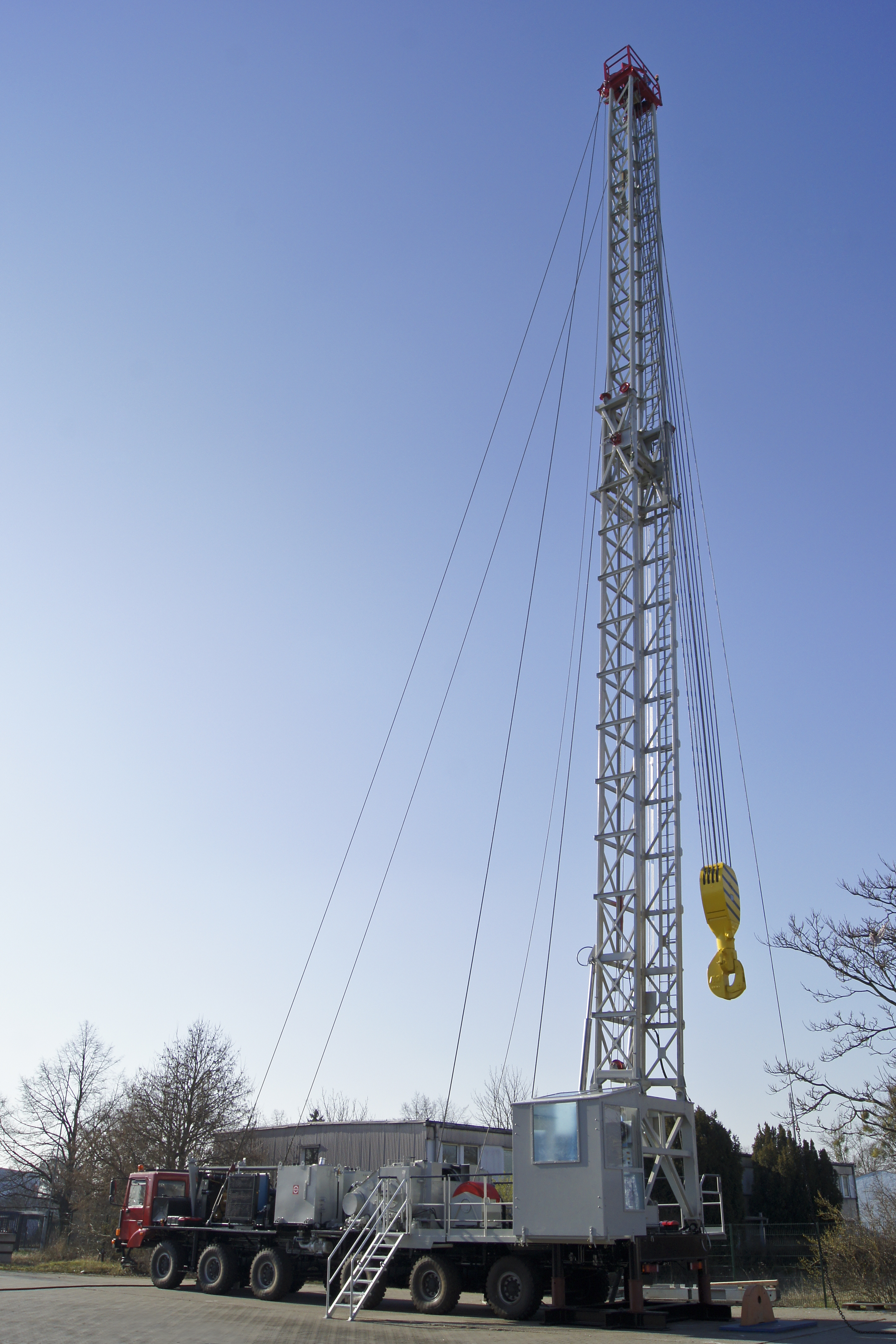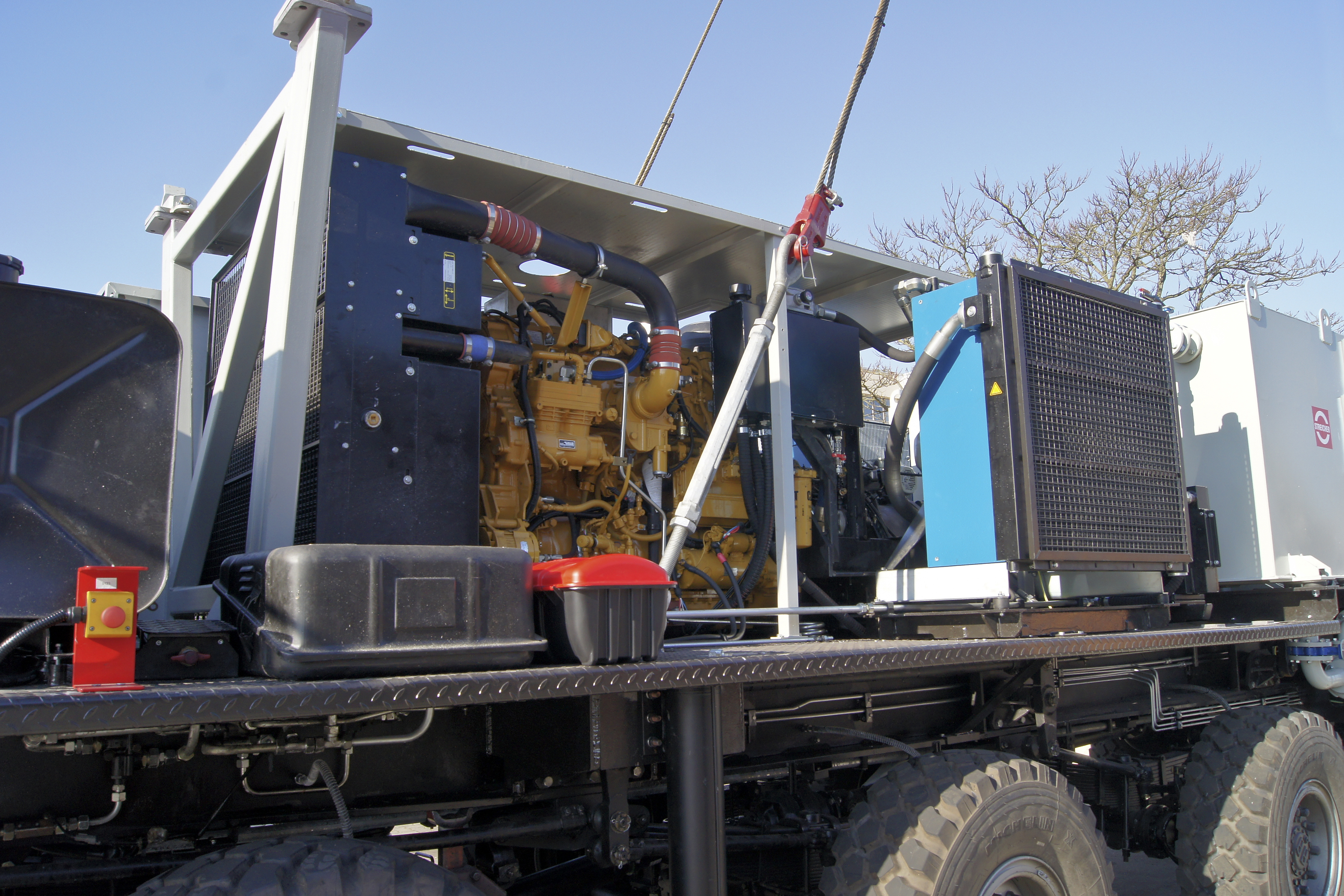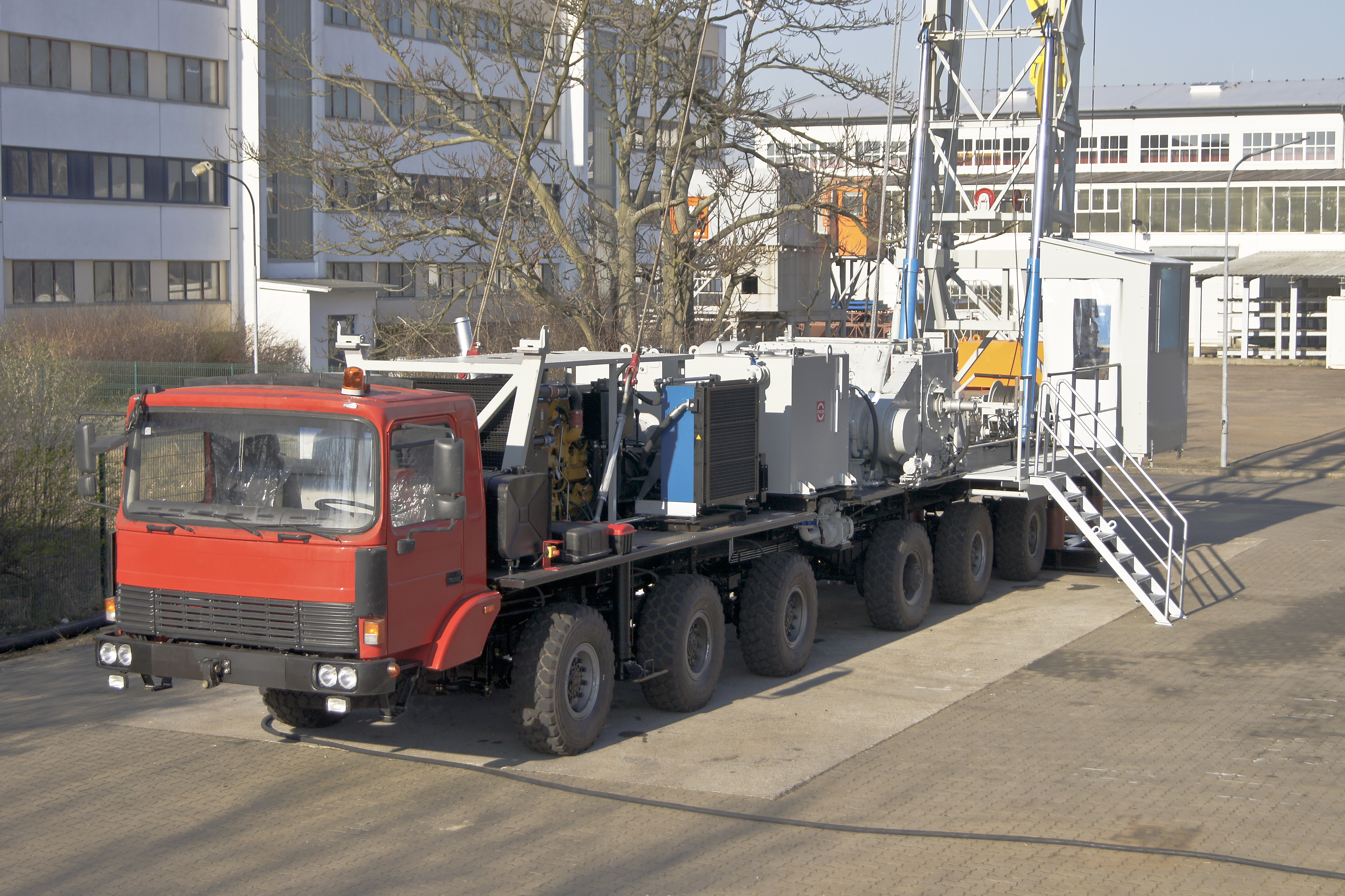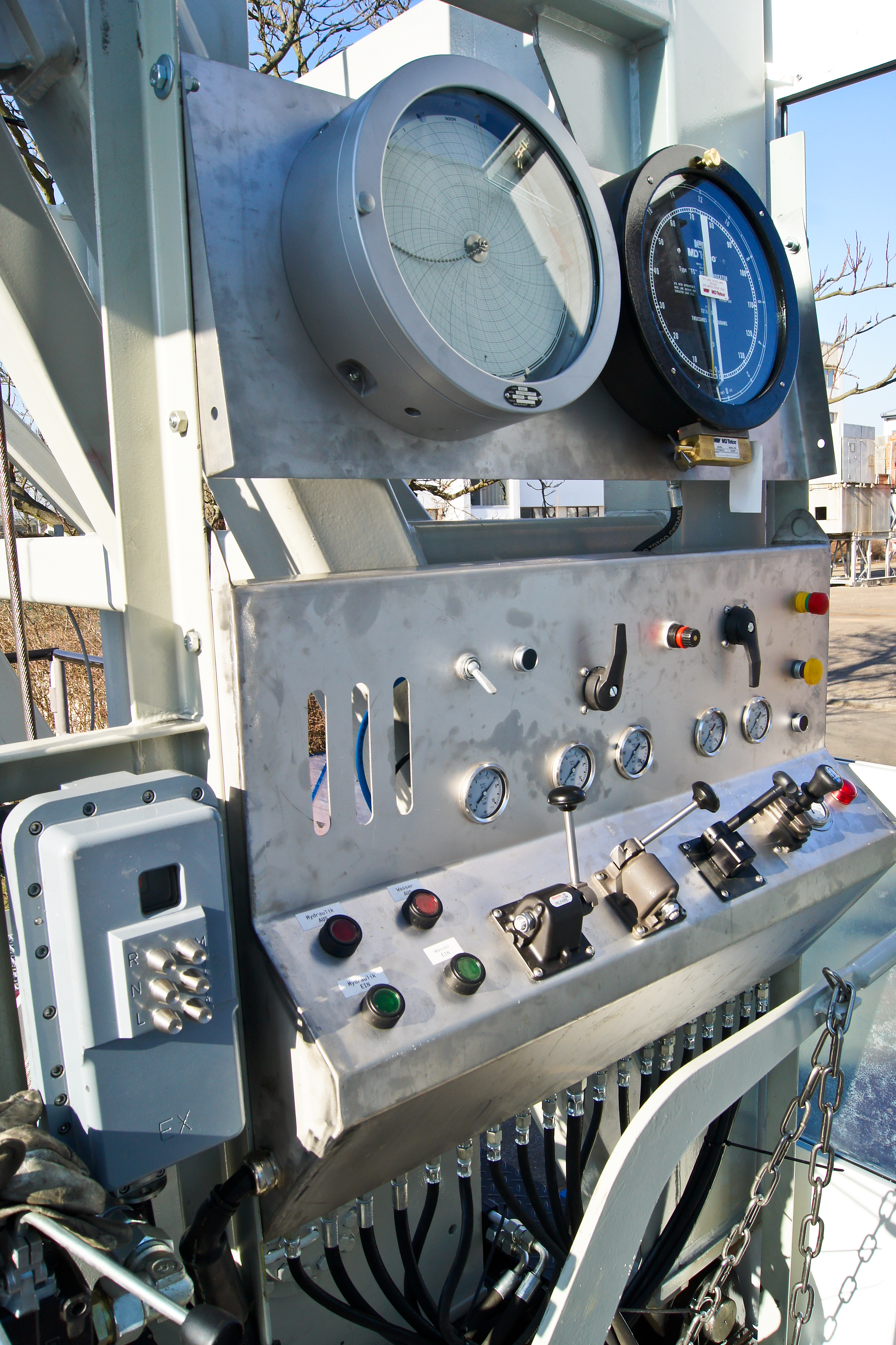 Large red and black mobile drilling truck parked near industrial buildings. Industrial engine and machinery mounted on the back of a flatbed truck. Industrial control panel with gauges, dials, and levers outdoors in sunlight. Large industrial truck with metal equipment parked outdoors near a building. Large mobile drilling rig with a tall metal tower under a clear blue sky.